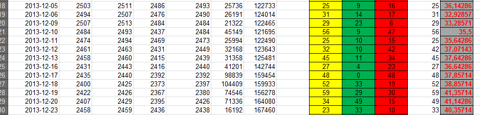 Jeżeli zwykła dzienna zmienność pokrywa ATR(10) w minimum 60% to każda powyższa wartość pomiędzy 0% – 40% może być świetną okazją do zajęcia pozycji krótkiej dla świec spadkowych ze stop losem powyżej szczytu intraday – lub gdy wartość kursu względem dziennej zmienności znajdzie się w w przedziale 80-100% – przedział ten można również traktować jako okazja do odwrócenia pozycji. Analogicznie jeżeli ATR zostanie pokryty podczas wzrostów :-)