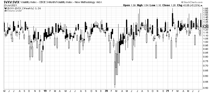W strategii VXV:VIX dla E-mini S&P 500 Futures pojawił się kolejny sygnał sprzedażowy na 26-27 lipca. Sygnał generowany jest przez odczyt wskaźnika VXV:VIX powyżej poziomu 1.25 na koniec tygodnia – VXV:VIX i S&P 500 Futures.